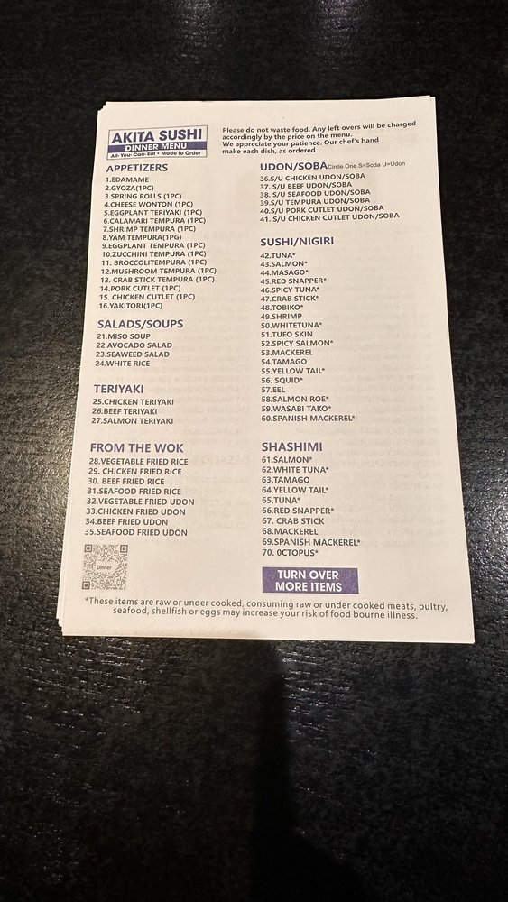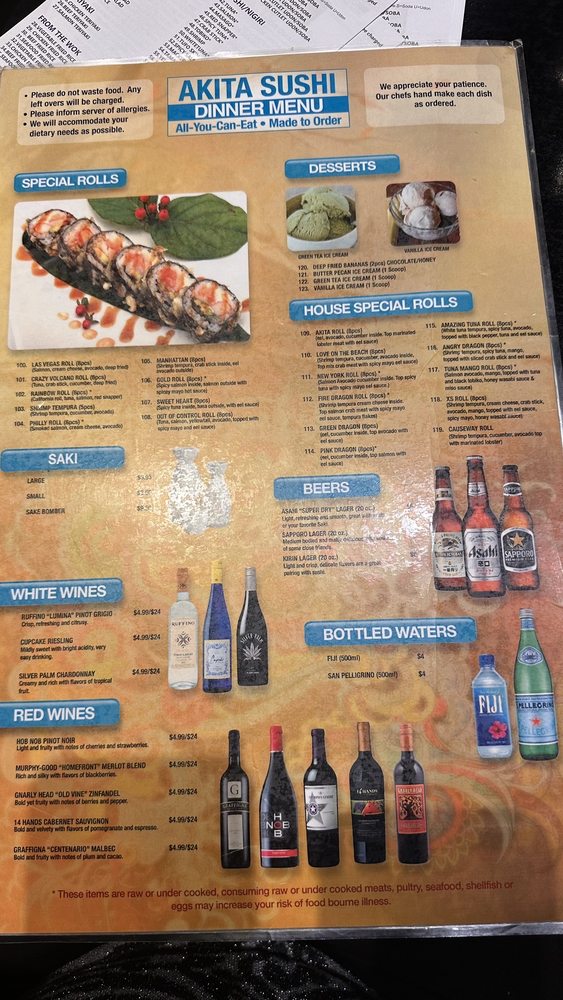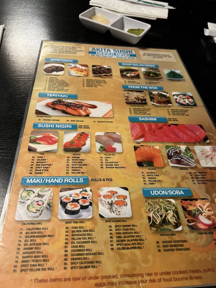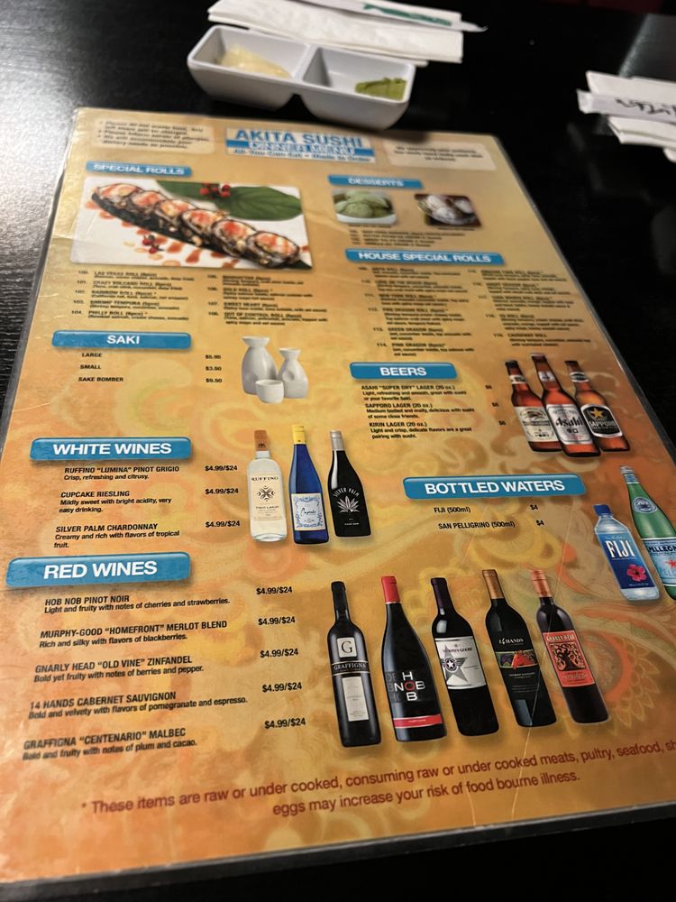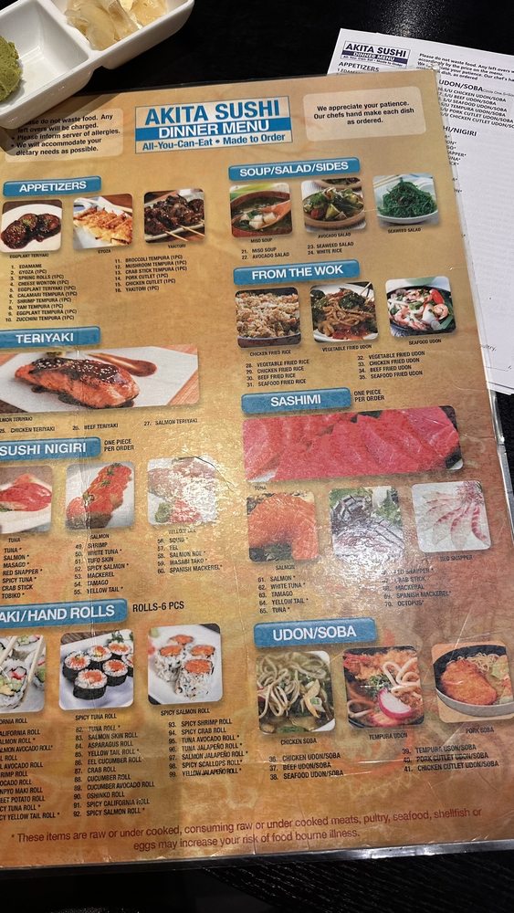 Akita Sushi, located in Scottsdale, AZ, offers a range of Japanese cuisine with options for vegans and vegetarians. With a casual ambiance and friendly service, the restaurant provides a diverse menu including sushi, sashimi, hot soups, and appetizers like edamame and tempura. Customers rave about the freshness and quality of the dishes, with one reviewer praising the all-you-can-eat option and another highlighting the affordable prices and delicious salmon nigiri. The menu features a variety of sushi rolls with creative combinations like the "Out of Control Roll" and the "Angry Dragon Roll." Whether you're a sushi enthusiast or looking to try something new, Akita Sushi provides a satisfying dining experience with quick and attentive service.