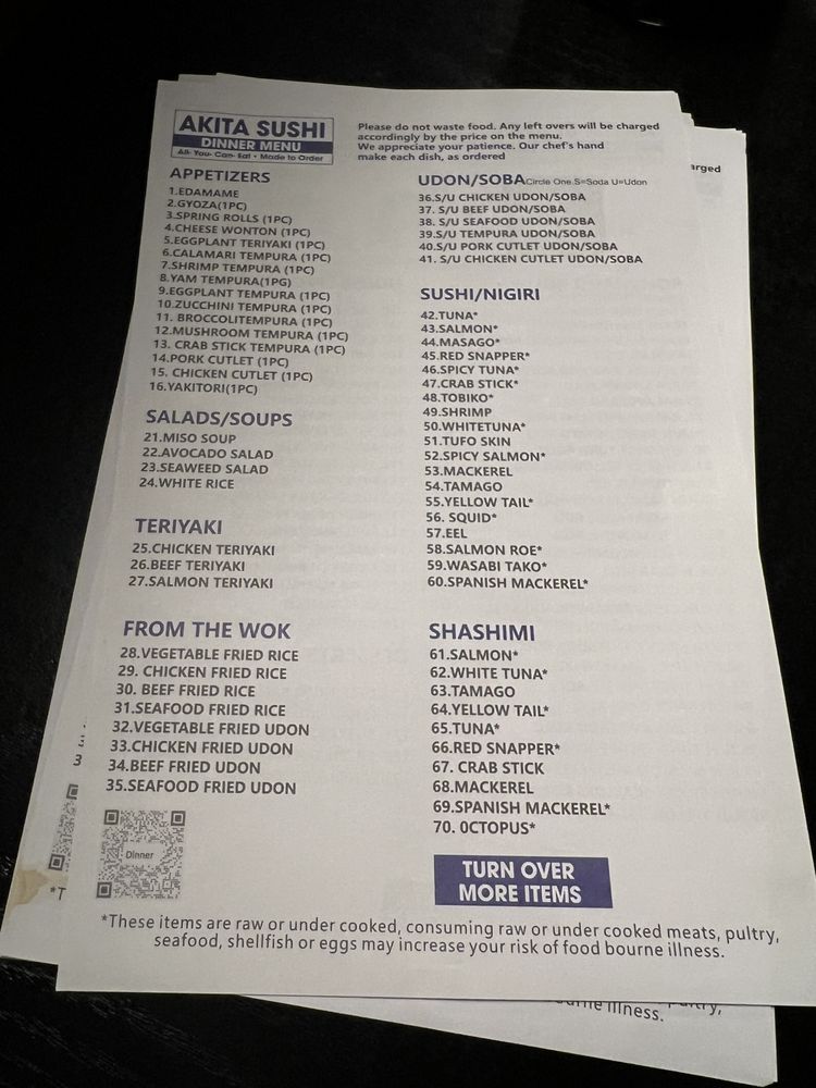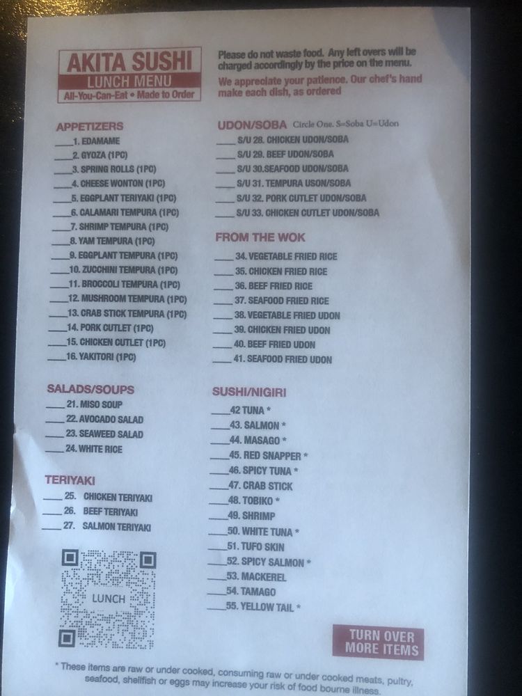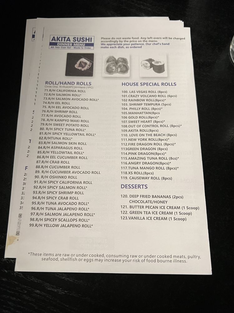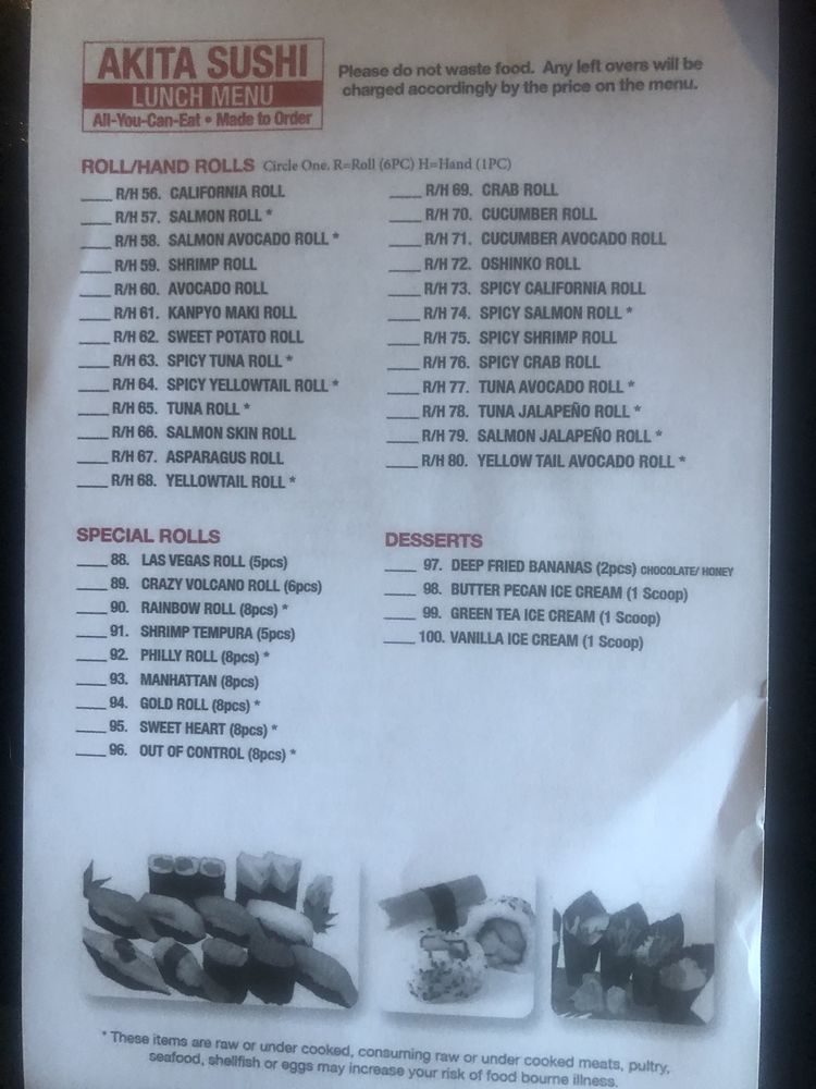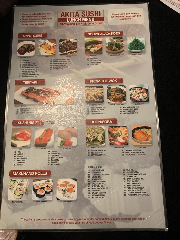 Akita Sushi, located in Scottsdale, AZ, offers a range of Japanese cuisine with options for vegans and vegetarians. With a casual ambiance and friendly service, the restaurant provides a diverse menu including sushi, sashimi, hot soups, and appetizers like edamame and tempura. Customers rave about the freshness and quality of the dishes, with one reviewer praising the all-you-can-eat option and another highlighting the affordable prices and delicious salmon nigiri. The menu features a variety of sushi rolls with creative combinations like the "Out of Control Roll" and the "Angry Dragon Roll." Whether you're a sushi enthusiast or looking to try something new, Akita Sushi provides a satisfying dining experience with quick and attentive service.