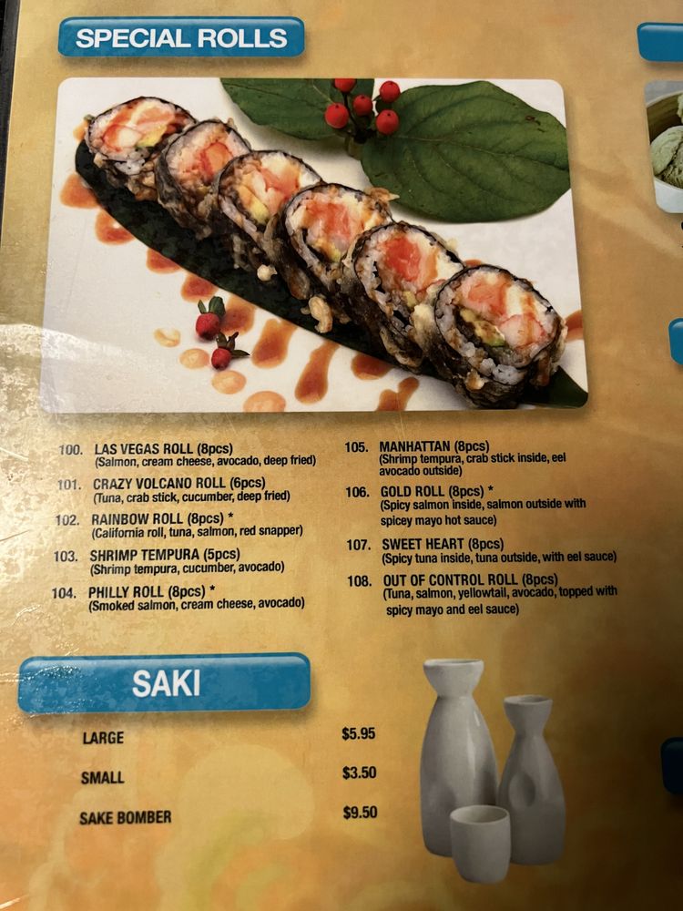8 pieces. Shrimp tempura, cream cheese, crab stick, avocado, mango, topped with eel sauce, spicy mayo and honey wasabi sauce.